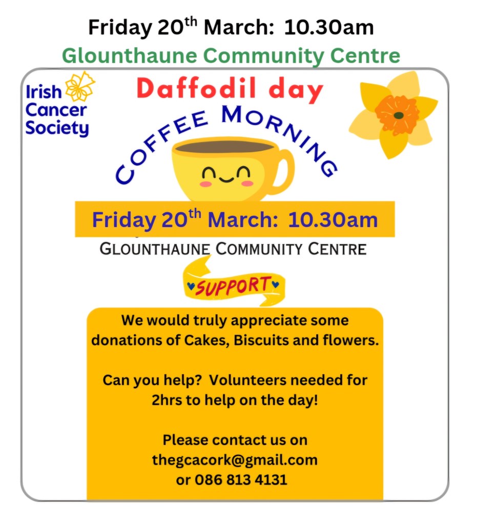 Please join us for our annual Daffodil Day coffee morning in aid of the Irish Cancer Society in Glounthaune Community Centre.